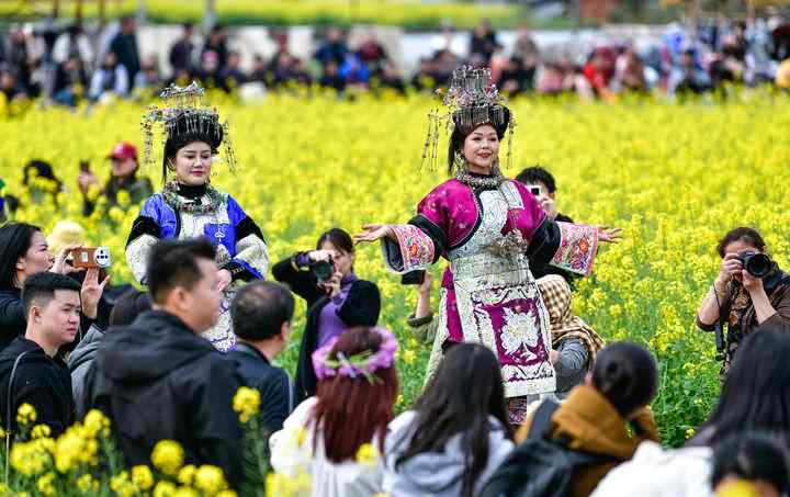 在贵州省榕江县车江大坝,村民身着民族服装参加花田走秀(2025年3月16日摄)。新华社记者 杨文斌 摄