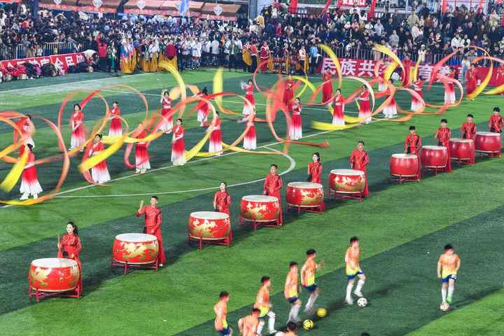 演员在2025年“村超”开幕式上表演节目(2025年1月4日摄)。新华社记者 杨文斌 摄