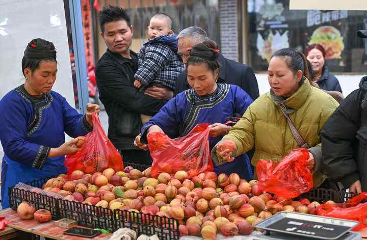 村民在贵州省榕江县忠诚镇“村超村集”选购水果(2025年1月21日摄)。新华社记者 杨文斌 摄