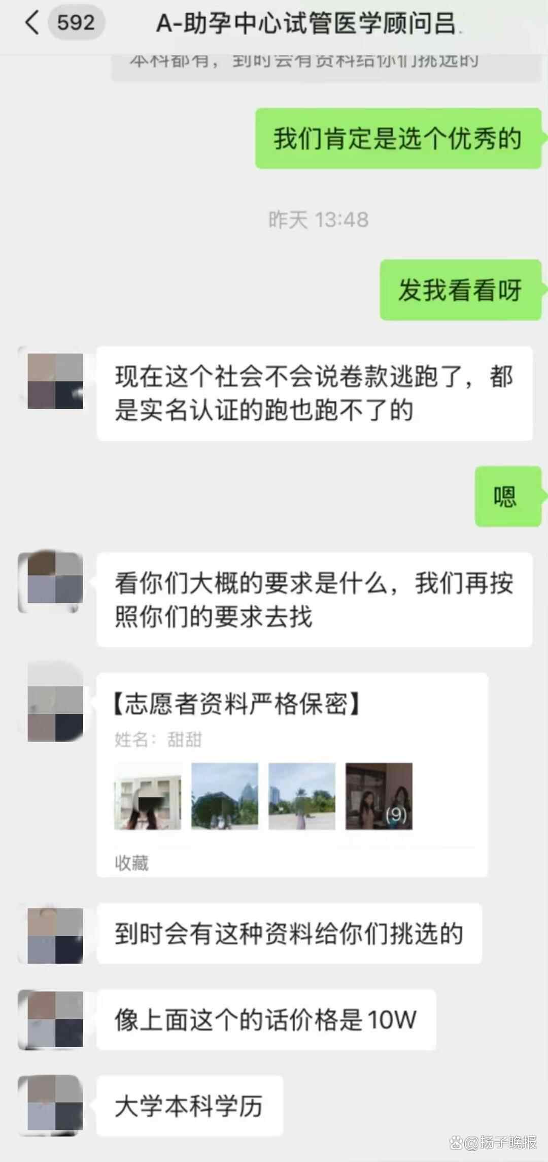 相关聊天记录显示,“医学顾问”吕某称,该公司提供“代孕志愿者”(其业内称为“卵妹”),随着“卵妹”学历的不同,供卵价格也不同。其中,研究生学历的“卵妹”价格15万元,本科学历的“卵妹”为10万元。吕某称,如对“卵妹”的学历有怀疑,求代孕者可至学信网查询,不存在造假一说。