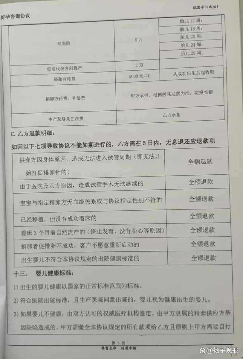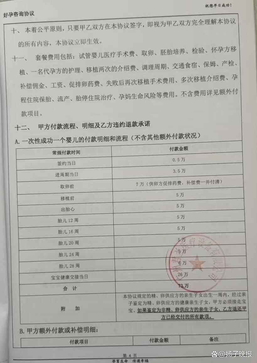 记者获得的一份可靠信源显示,今年51岁的龙某在寻求代孕前已离异,他找到广州君兰医疗设备有限公司签订了《好孕咨询协议》,该协议约定代孕成功并认领孩子后,总共需支付73万元。其中,签约当日支付0.5万,进周期当日支付3.5万,取卵前支付7万,移植前支付5万,出胎心支付5万,胎儿从12周、16周、20周、24周各支付5万,至28周支付6万,宝宝健康交接当日支付26万。