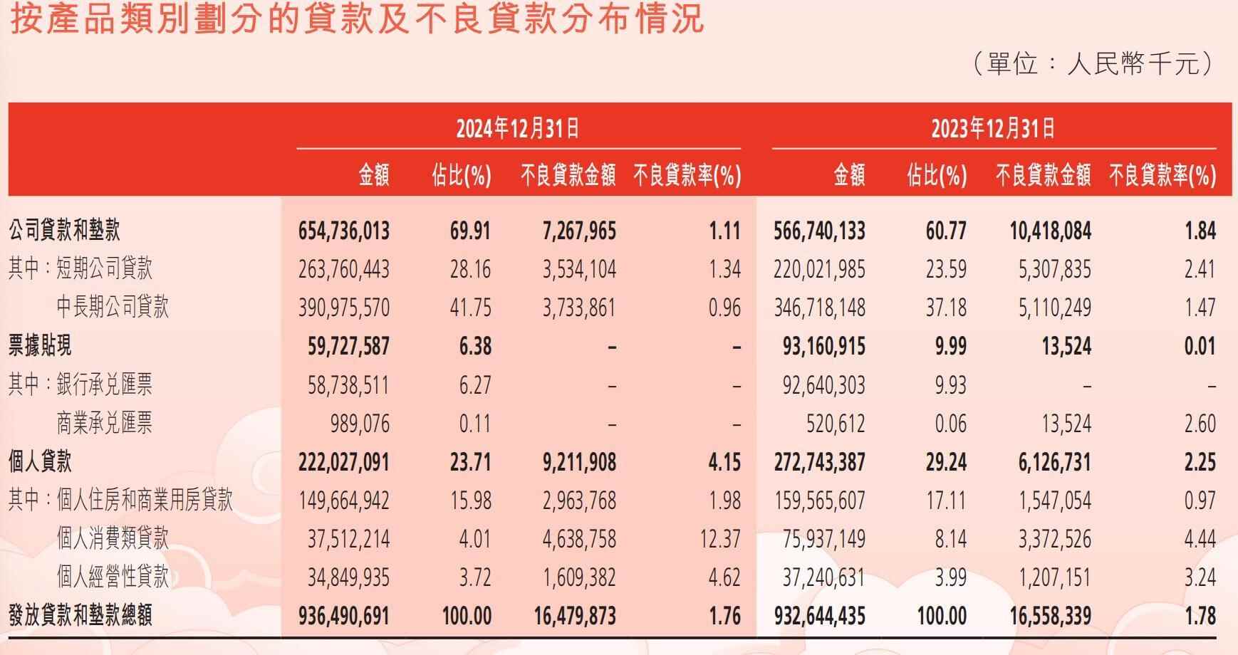 个人贷款中,个人住房和商业用房贷款不良余额较2023年末增长了14.17亿元,不良率从0.97%上升至1.98%;个人消费类贷款不良余额增长了12.66亿元,不良率从4.44%猛增至12.37%;个人经营性贷款不良率也从3.24%增至4.62%。