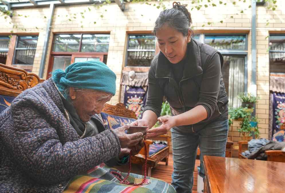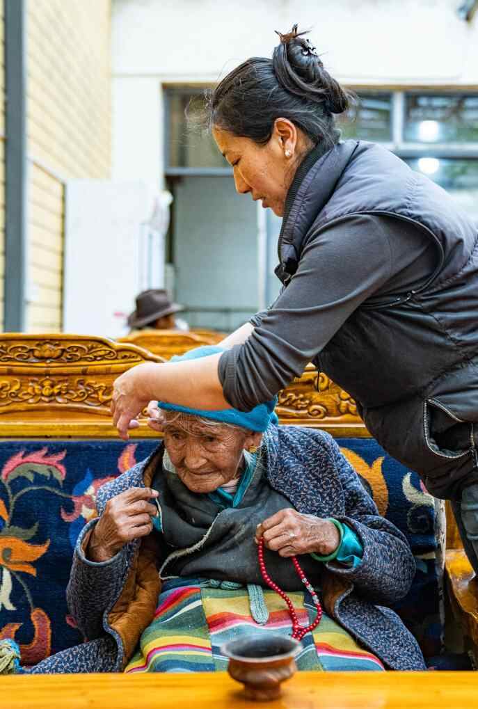 孙媳妇在帮助玉珍奶奶整理头巾(3月12日摄)。新华社记者 丁增尼达 摄