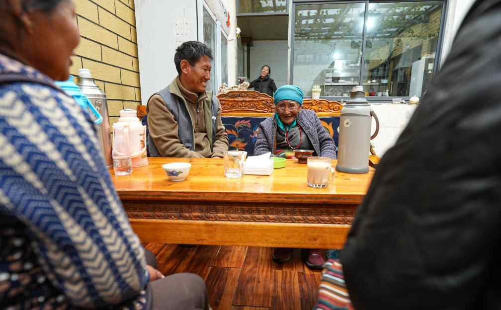 玉珍奶奶在自家的茶馆里和孙子及邻居喝茶聊天(3月12日摄)。新华社记者 晋美多吉 摄