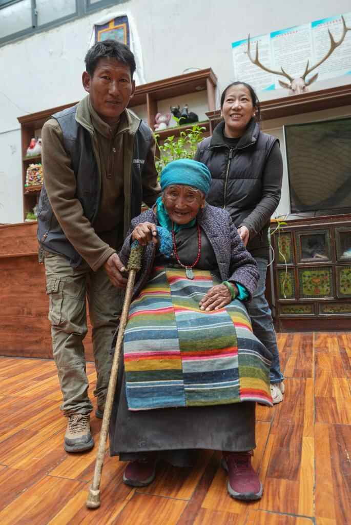 玉珍奶奶(中)和孙子、孙媳妇合影(3月12日摄)。新华社记者 晋美多吉 摄