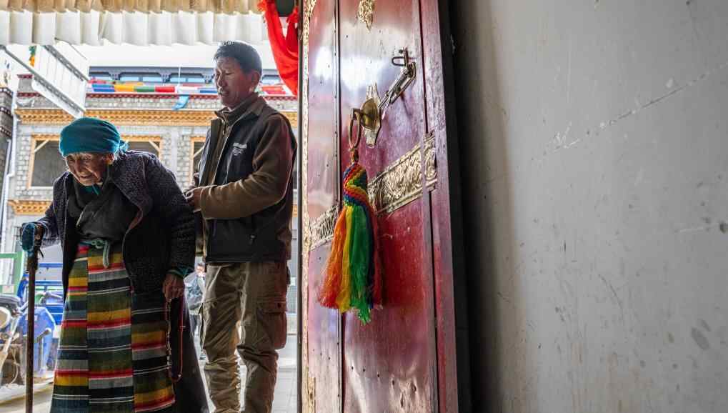 孙子照看着玉珍奶奶回屋(3月12日摄)。新华社记者 丁增尼达 摄