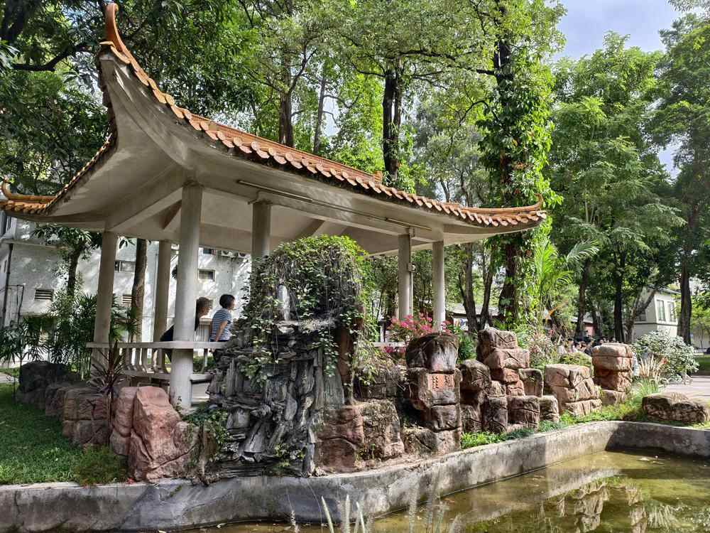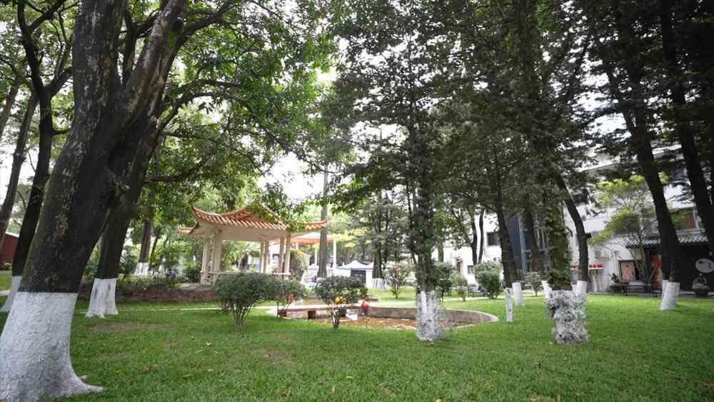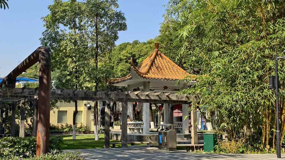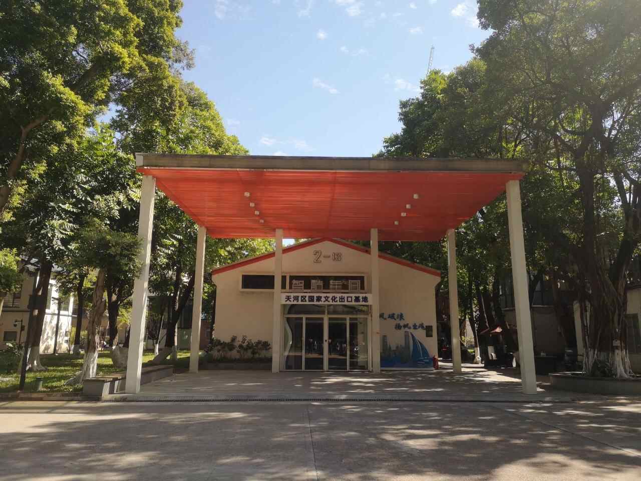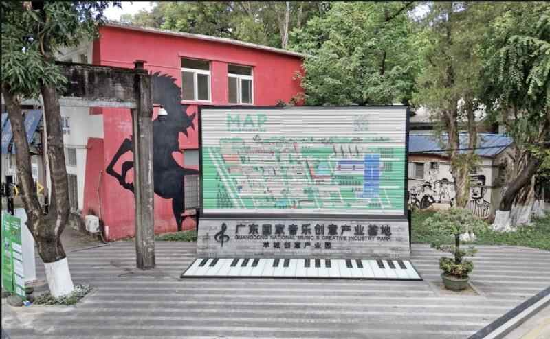 从2号门踏入园区,仿若踏入时光回廊,一座建于上世纪六七十年代的凉亭静静伫立,一旁,去年年末新种的翠竹迎风挺立。路的那头,一块连接着钢琴键盘的“广东国家音乐创意产业基地”LED显示屏,让方寸空气都氤氲着艺术的律动。