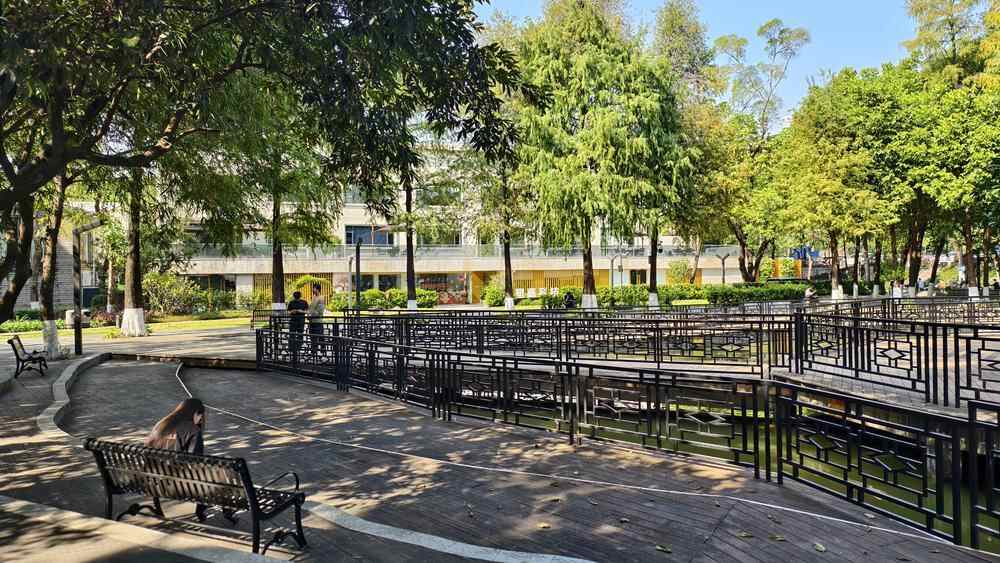 由3号门深入园区,桂园这片口袋公园悄然铺展,在今年重新管护的茂盛草地上,一棵棵桂花树亭亭玉立。今年新设的4张座椅,成为午休时刻人们的“避风港”,人们或静坐养神,或漫步桂园水榭,品味驳岸外的美景。
