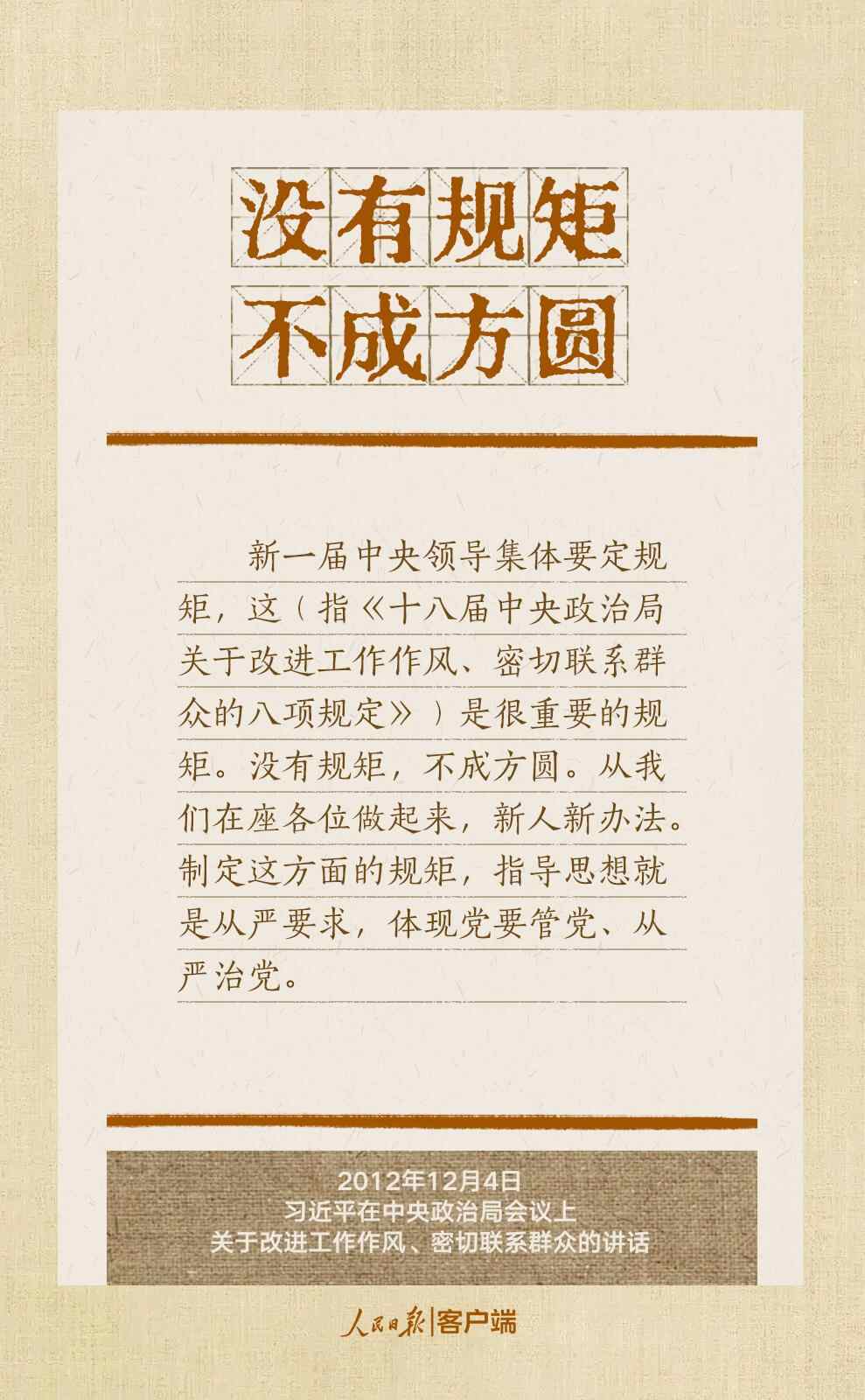 党的十八大以来,习近平总书记多次就抓好党的作风建设、贯彻落实中央八项规定精神发表重要讲话,作出重要批示,提出明确要求。“没有规矩,不成方圆”、“己不正,焉能正人”、“尽小者大,慎微者著”……总书记引用的这些古语耐人寻味。