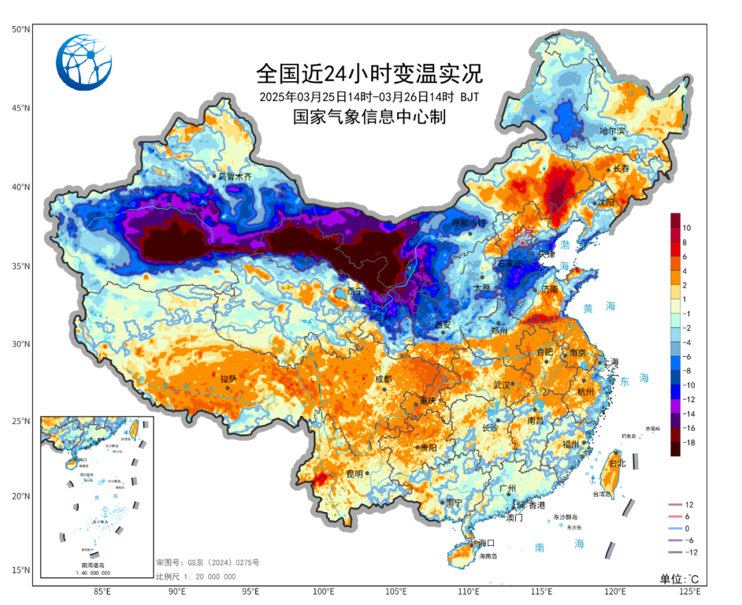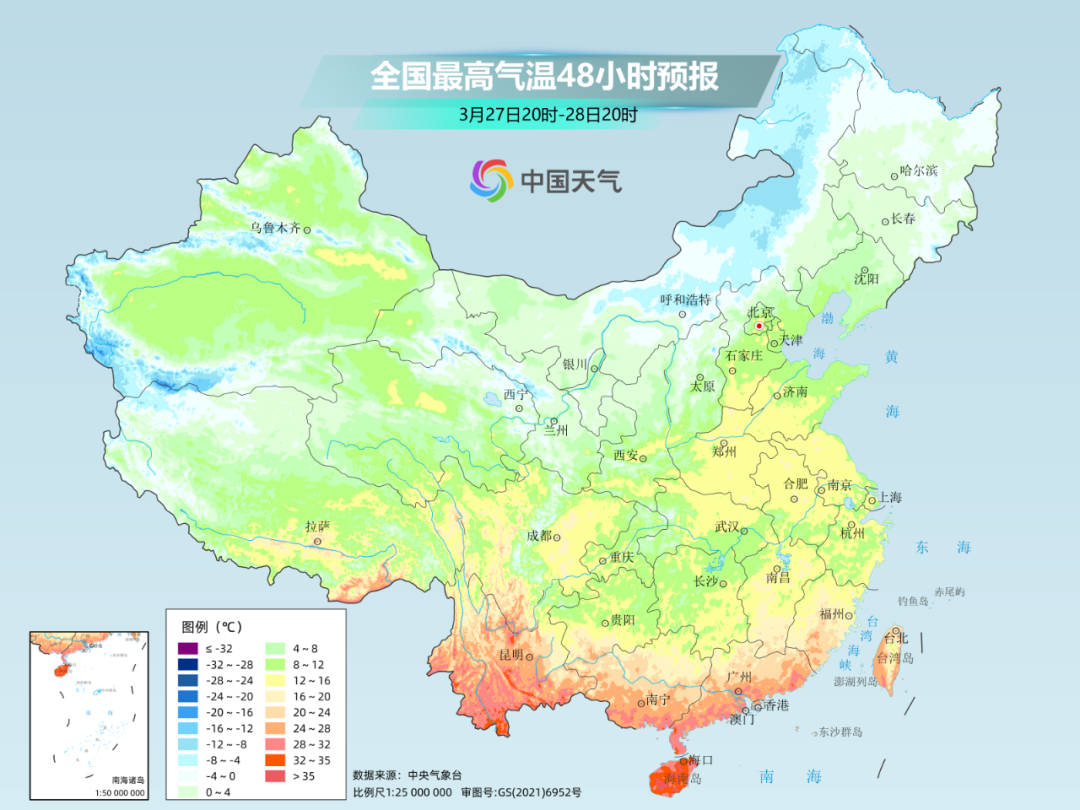 后天,降温推进到华南,降温核心区域也将转移至长江以南,西南地区东部、华南北部、江南多地最高气温将下滑15℃以上、局地降幅超20℃。