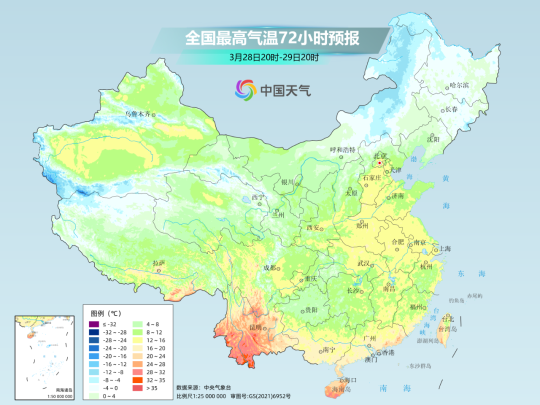 寒潮到来之前,今天的黄河以南大部地区仍是被温暖的南风主宰,将本就偏高的气温推向更高。