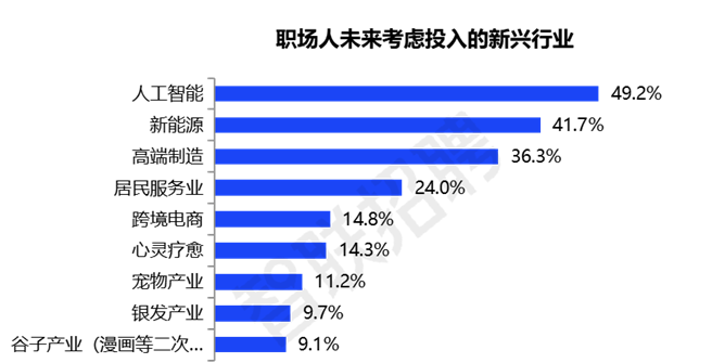 聚焦新兴领域,智联招聘数据显示,有跳槽意愿或行动的职场人中,49.2%希望未来能投身到人工智能领域,其次是新能源领域,占比41.7%。前五的热门新兴领域还有高端制造、居民服务业、跨境电商,比例分别为36.3%、24%、14.8%。