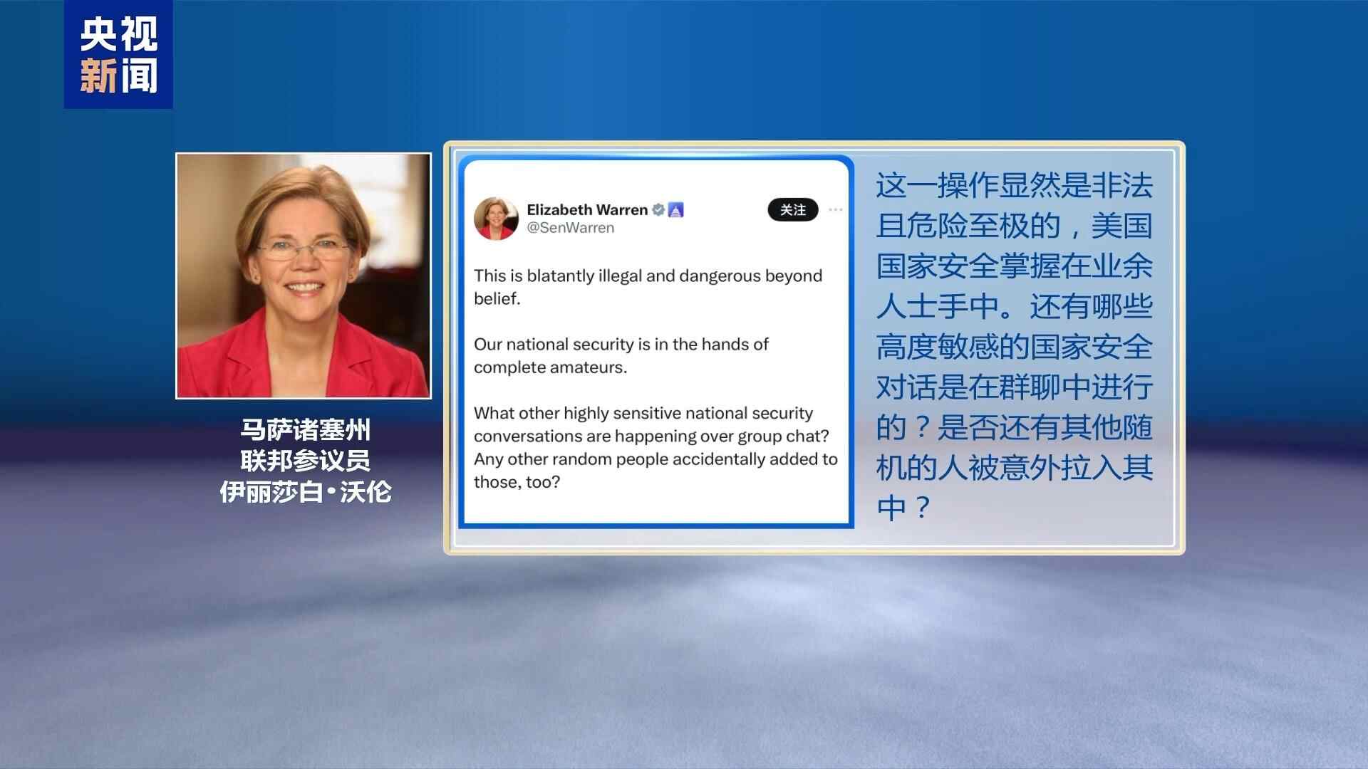 马萨诸塞州联邦参议员伊丽莎白·沃伦在社交媒体上称,这一操作显然是“非法”且“危险至极的”,美国国家安全掌握在业余人士手中。她质问道,“还有哪些高度敏感的国家安全对话是在群聊中进行的?是否还有其他随机的人被意外拉入其中?”