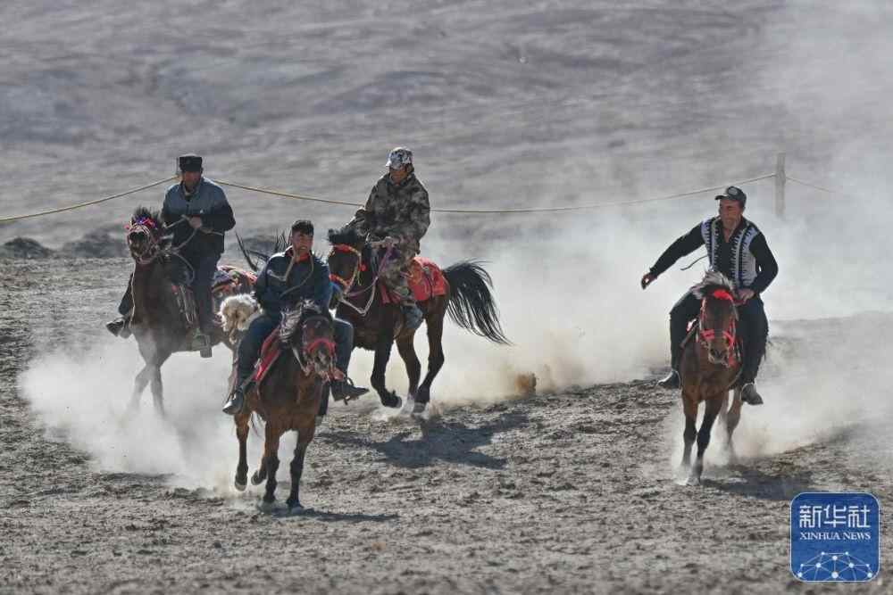 ↑ 3月22日,在新疆塔什库尔干塔吉克自治县瓦恰乡,当地村民为游客展示非物质文化遗产“叼羊”运动。