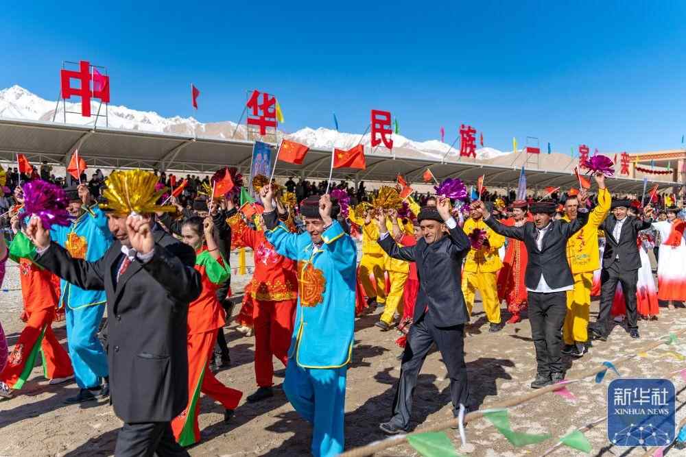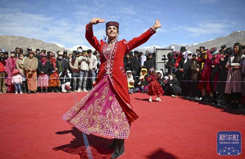 ↑ 在新疆塔什库尔干塔吉克自治县提孜那甫乡赛马场,参与非遗展演的村民在跳舞(3月23日摄)。