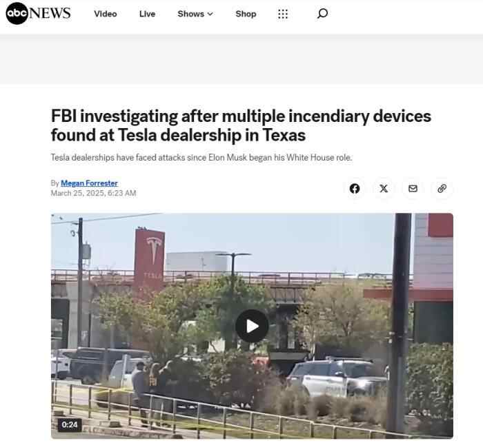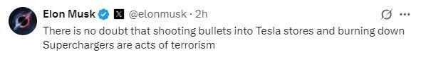 他在社交媒体X上发文称:“毫无疑问,枪击特斯拉经销店和在充电站纵火是恐怖主义行为。”