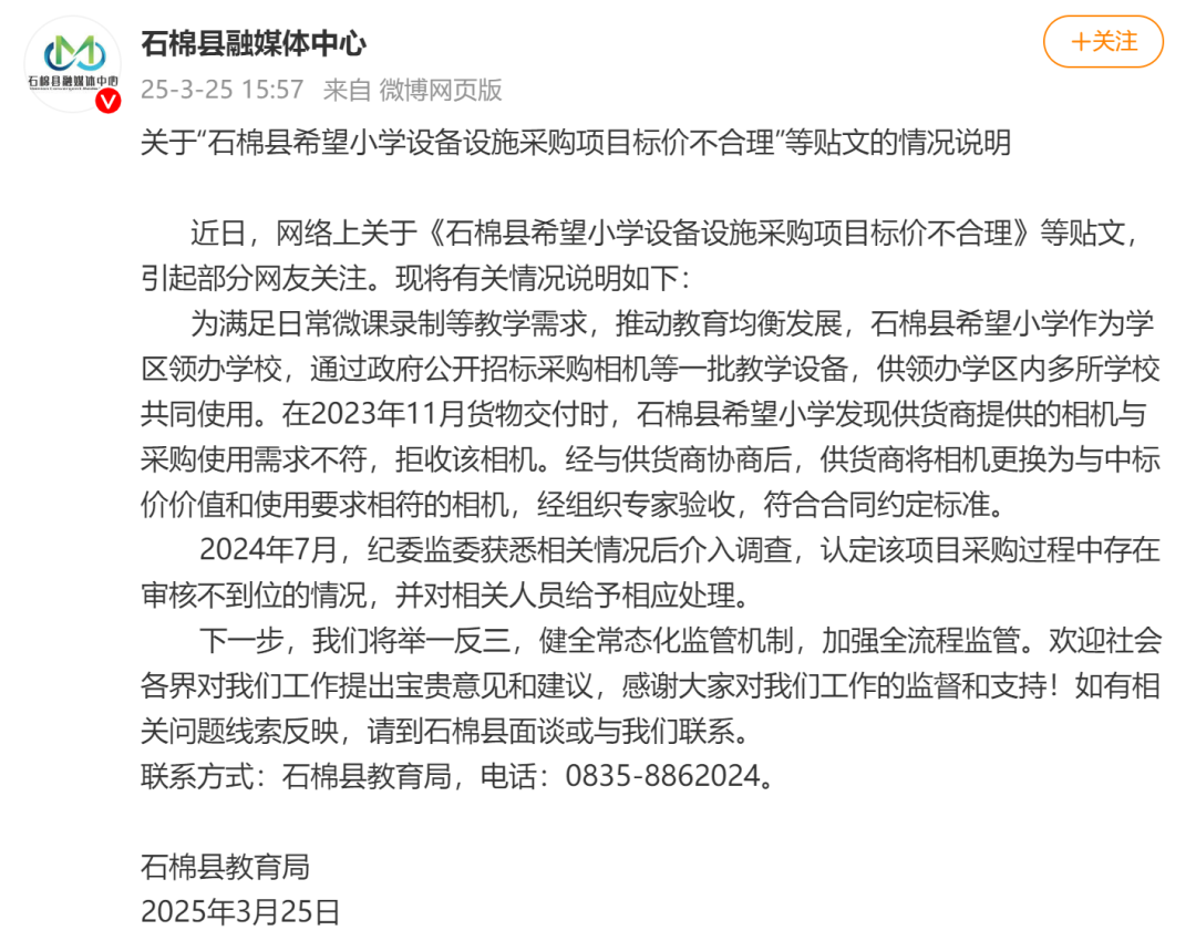近日,有网友反映,2023年四川省石棉县希望小学采购的“松典相机”中标价格14050元,而该相机网络售价仅631元,质疑其中标价格不合理。