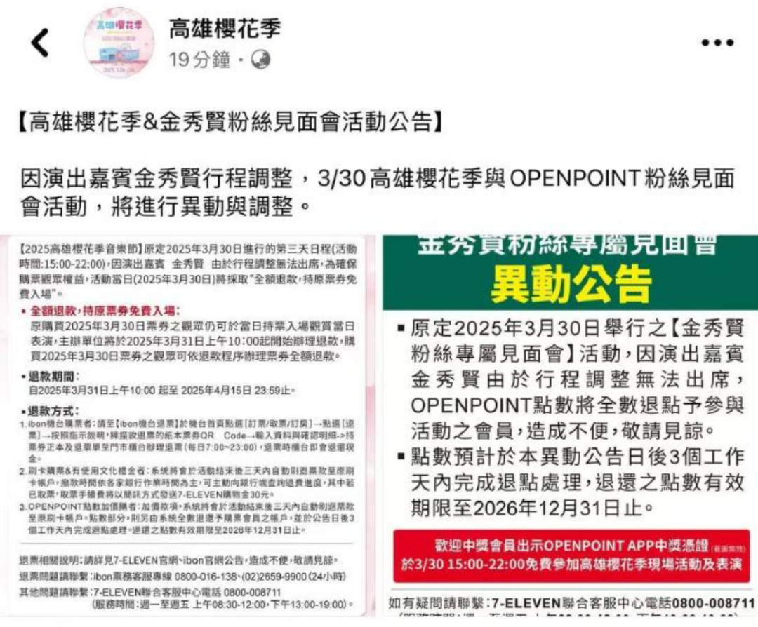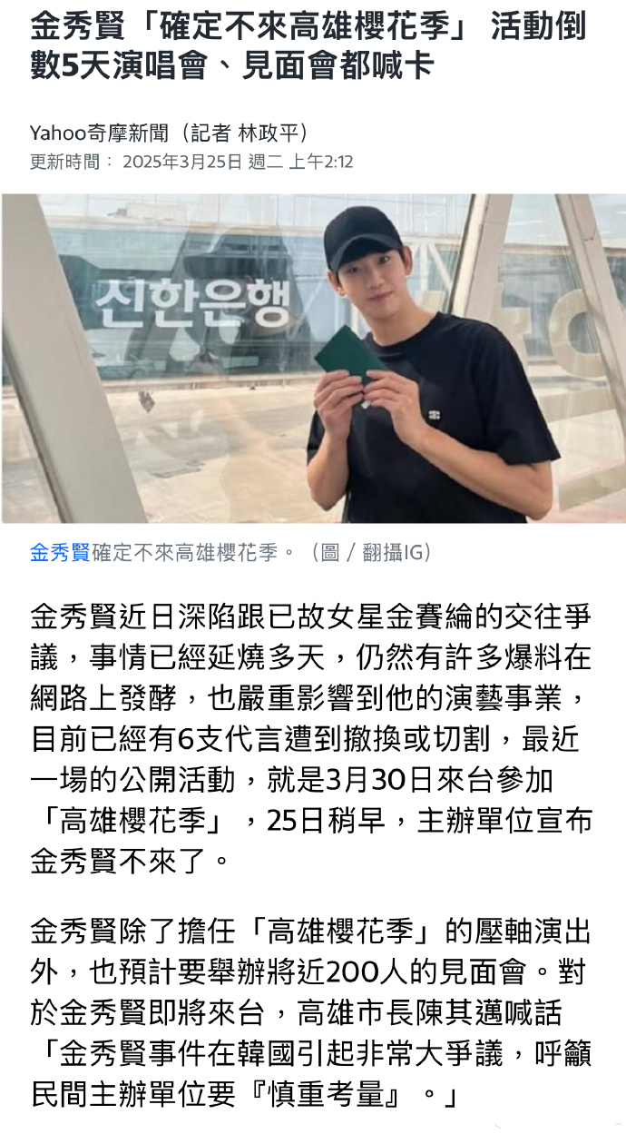 3月25日,据台媒报道,金秀贤原计划于3月30日来台参加“高雄樱花季”活动,因行程调整将无法出席此次活动及相关见面会。