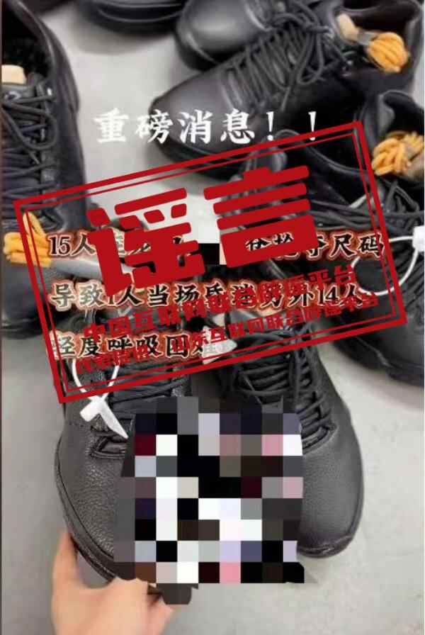 真相:近日,有网民在某平台上发布视频称:“重磅消息!!15人在龙口某仓库抢夺尺码,导致1人当场昏迷,另外14人轻度呼吸困难,天降之祸”,引发社会关注。山东龙口网信部门巡查发现该情况后立即联合当地公安部门启动调查程序。调查发现,此视频发布者系当地品牌运动折扣店店主刘某。图中“抢夺尺码”是指断码甩卖的鞋子,有时商家为吸引顾客会搞类似的优惠活动。而刘某为博取流量,吸引关注,自行编造并发布了上述谣言。目前,龙口公安已依法对刘某进行行政处罚。(来源:山东互联网联合辟谣平台)