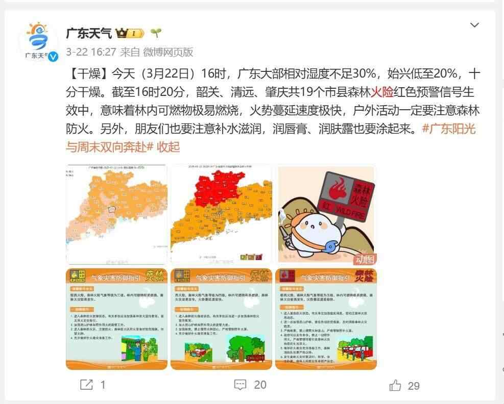 3月22日,广东省气象服务中心官方微博@广东天气发布提醒称,截至当天16时,“广东大部相对湿度不足30%,始兴低至20%,十分干燥。截至16时20分,韶关、清远、肇庆共19个市县森林火险红色预警信号生效中,意味着林内可燃物极易燃烧,火势蔓延速度极快,户外活动一定要注意森林防火。”