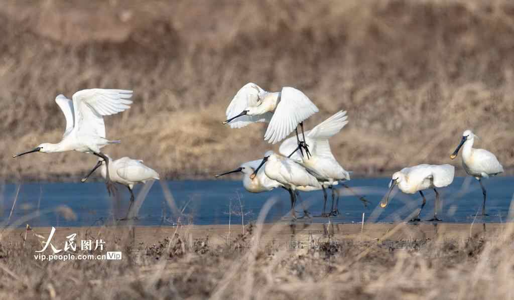 2025年3月22日,国家二级保护鸟类白琵鹭在山西左权清漳河国家湿地公园飞翔、觅食、嬉戏。张文军摄(人民图片网)