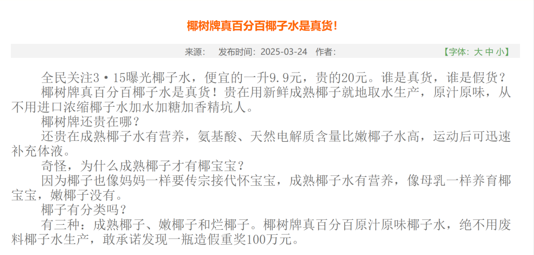3月24日,椰树集团官网发文称:椰树牌椰子水从不用进口浓缩椰子水加水加糖加香精坑人,发现一瓶造假奖100万。
