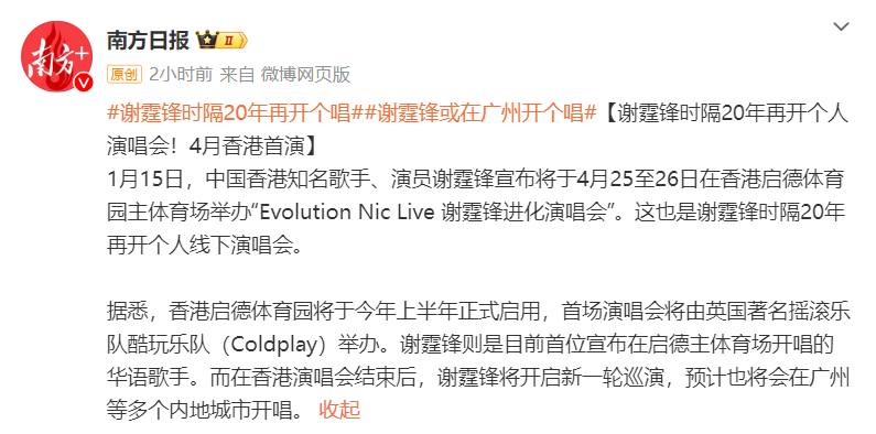 据媒体报道,香港启德体育园将于今年上半年正式启用,首场演唱会将由英国著名摇滚乐队酷玩乐队(Coldplay)举办。谢霆锋则是目前首位宣布在启德主体育场开唱的华语歌手。而在香港演唱会结束后,谢霆锋将开启新一轮巡演,预计也将会在广州等多个内地城市开唱。