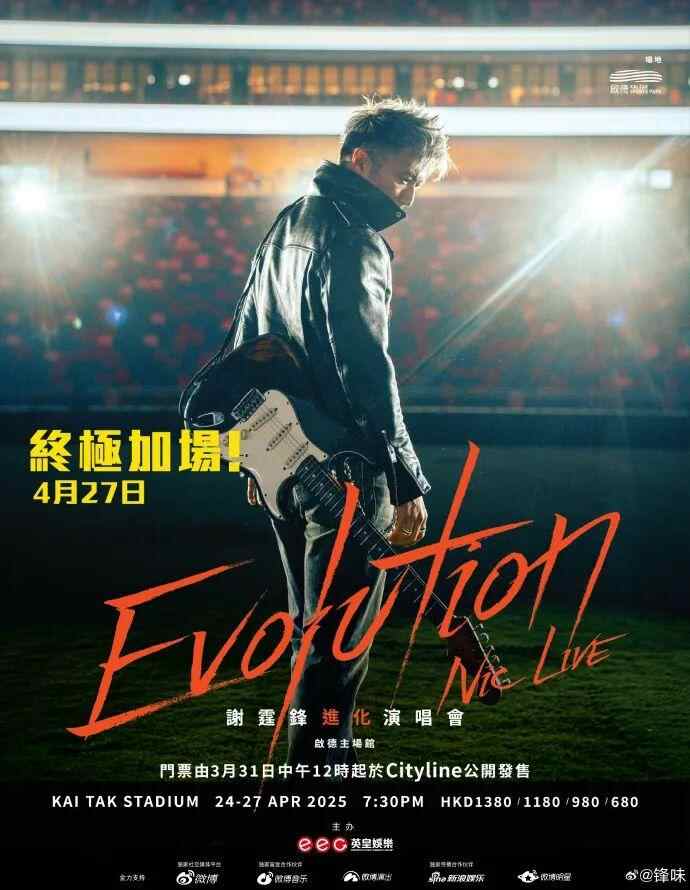 最后的海报显示,谢霆锋“进化”演唱会将于2025年4月25日至26日,每晚7点30分,在香港启德体育园的主场馆举办。票价为1380/1180/980/680港元。