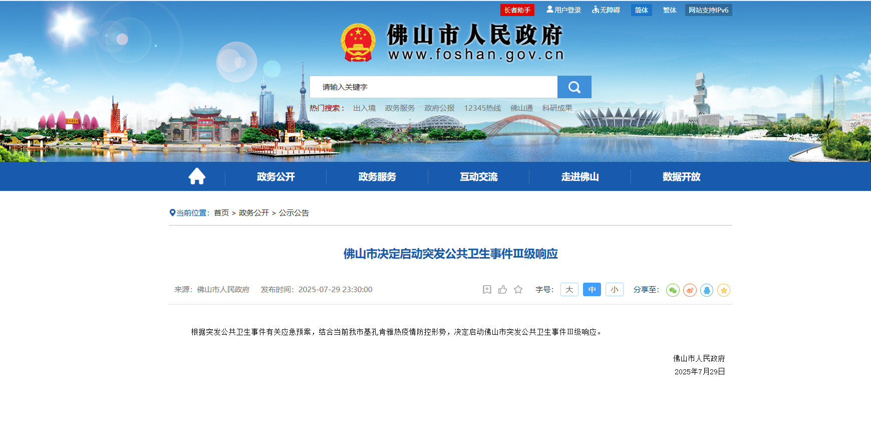 佛山市决定启动突发公共卫生事件Ⅲ级响应
