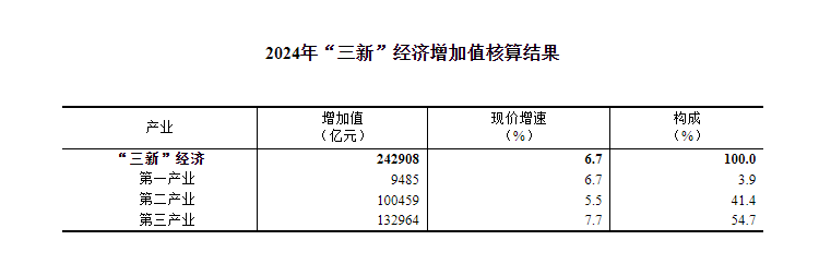 经核算,2024年我国“三新”经济增加值为242908亿元,比上年增长6.7%(按现价计算),比同期国内生产总值(GDP)现价增速高2.5个百分点;占GDP的比重为18.01%,比上年提高0.43个百分点。