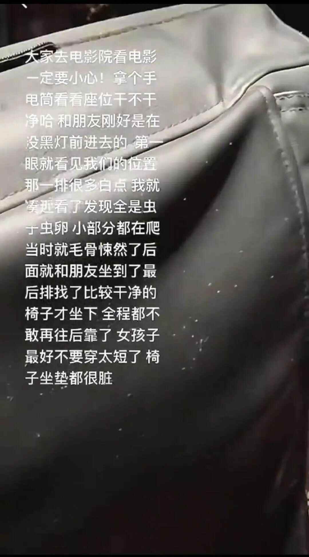 7月29日,一段网传视频显示,广东一女子在影院熄灯入场时发现座椅靠背上布满白色“虫卵”,引发公众对影院等公共环境卫生状况的担忧。