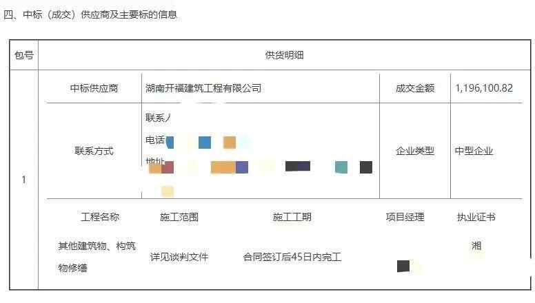 公告显示,湖南开福建筑工程有限公司以1,196,100.82 元中标,施工工期为合同签订后45日完工。