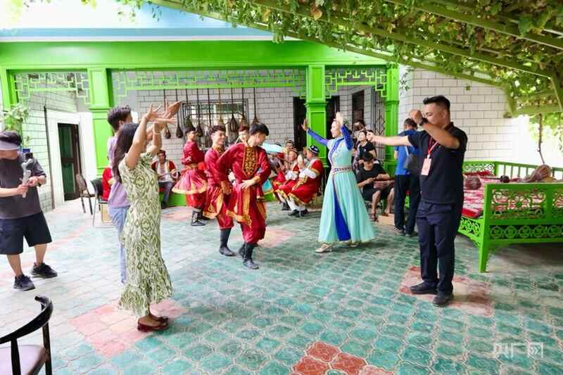 央广网阿克苏7月30日消息(记者梁瑜琳 丁安)7月27日,记者跟随“石榴花开 籽籽同心铸牢中华民族共同体意识”网络主题活动,走进新疆阿克苏地区新和县加依村。在自治区级乐器传承人努尔东·司马义的院落里,都塔尔琴弦调音声交织成曲,身着民族服装的当地艺人正随着琴弦跃动,与游客即兴共舞。