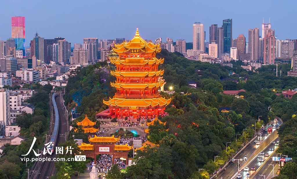 2025年7月30日晚,湖北省武汉市黄鹤楼景区内游人如织,游客们观黄鹤楼夜景,看《夜上黄鹤楼》沉浸式演出,感受荆楚文化魅力。杨东摄(人民图片网)