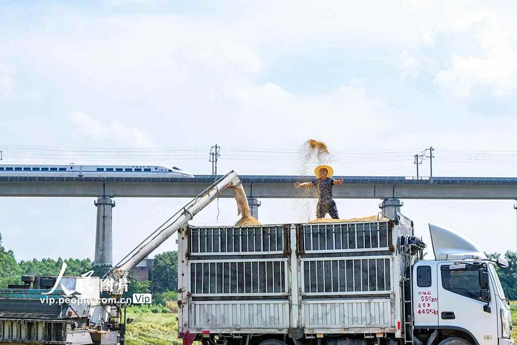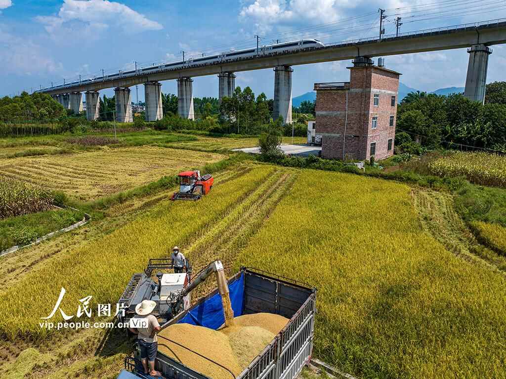 2025年7月30日,广西贺州市八步区莲塘镇,当地村民驾驶收割机在田间作业,抢抓农时加紧夏收。何华文摄(人民图片网)