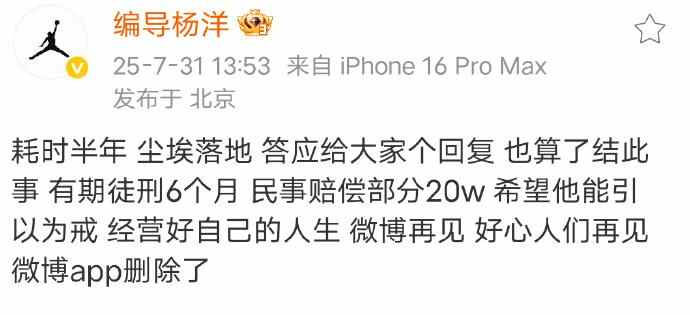 车主@编导杨洋 发文称:“耗时半年,尘埃落地,答应给大家个回复,也算了结此事。有期徒刑6个月,民事赔偿部分20w,希望他能引以为戒,经营好自己的人生。”