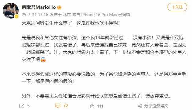 先是说我和其他女性有小孩,这个我19年就辟谣过——没有小孩!又说是和双胞胎姐妹都谈过,我就看懵了。再后来造谣我自己妹妹,竟然还有人帮着圆,是因为一起被绑架了。哇,大家的想象力太丰富了,下一步该不会是和金字塔里的外星人交往了吧。