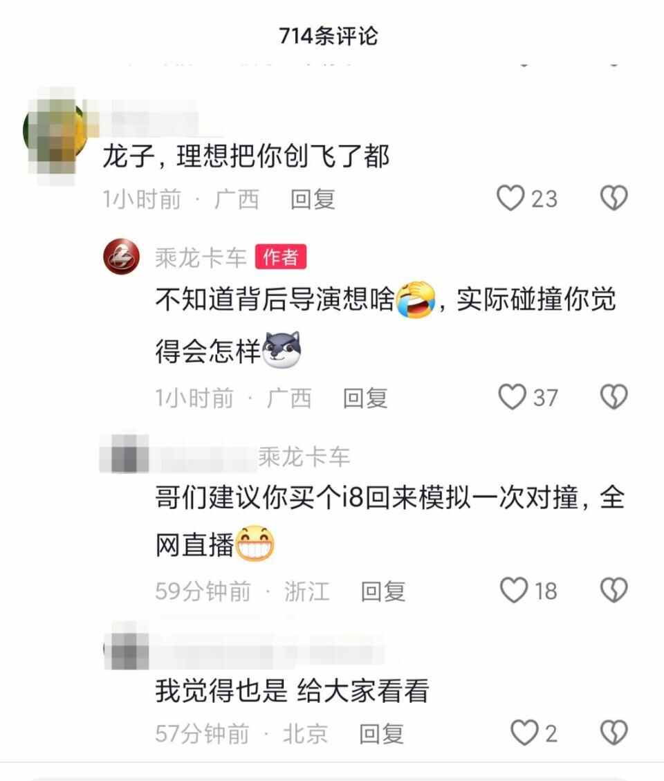 发布会过后,不少网友前往乘龙卡车官方抖音号留言,“一觉睡醒天塌了,没撞过理想。”“不敢买,后轮都撞飞起来了。”“本来想买,看了理想汽车宣传,放弃了。”
