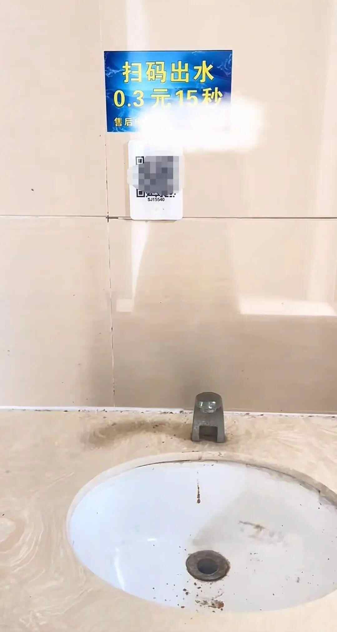 该网友拍摄的视频显示,一公共卫生间内,洗手池上方张贴了“扫码出水,0.3元15秒”的提示标语,下方张贴了一张付款的二维码贴纸,还标有售后服务的电话。记者注意到,该洗手池的水龙头没有安装开关和感应出水的装置。