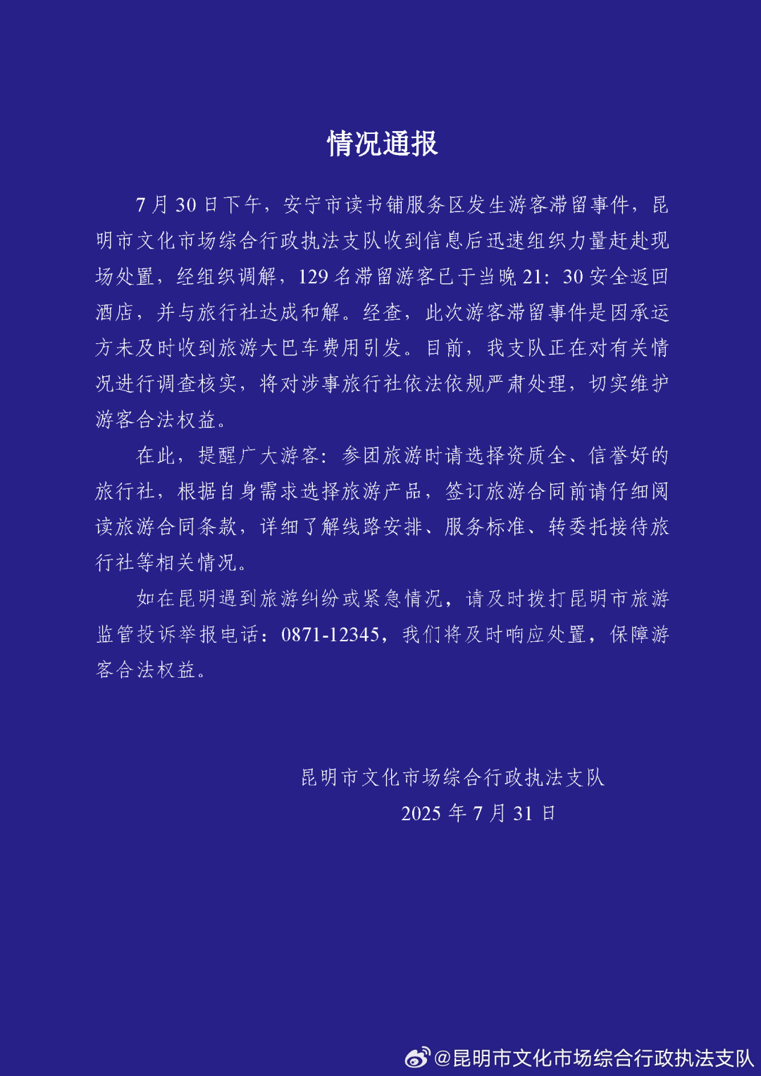 7月30日下午,安宁市读书铺服务区发生游客滞留事件,昆明市文化市场综合行政执法支队收到信息后迅速组织力量赶赴现场处置,经组织调解,129名滞留游客已于当晚21时30分安全返回酒店,并与旅行社达成和解。