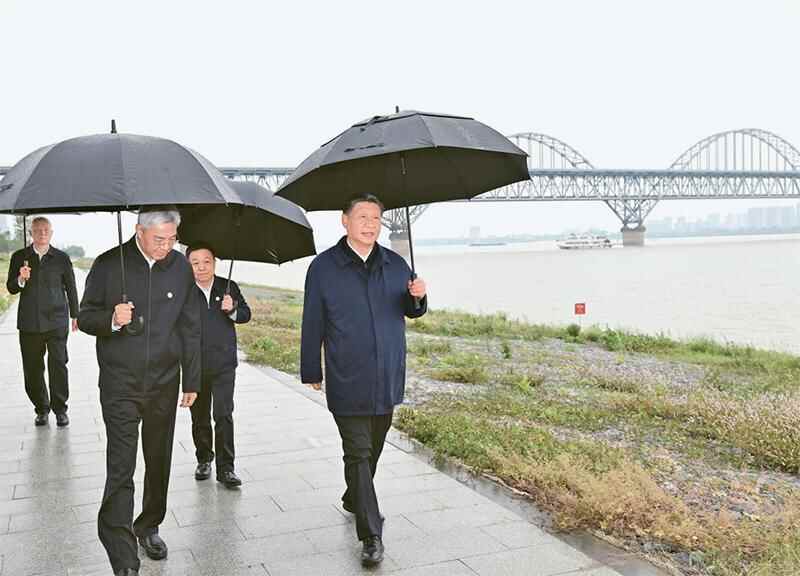 2023年10月10日至13日,中共中央总书记、国家主席、中央军委主席习近平在江西考察。这是10日下午,习近平在长江国家文化公园九江城区段考察时,冒雨沿江堤步行察看沿岸风貌。 新华社记者 谢环驰/摄