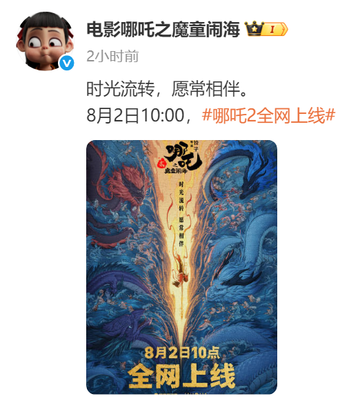 据@电影哪吒之魔童闹海 今天(7月31日)消息,《哪吒之魔童闹海》定档8月2日全网上线。