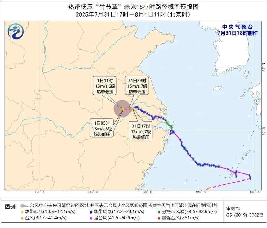 预计今天夜间,“竹节草”中心将会移入安徽东部,之后徘徊少动,可能在苏皖南部停留1至2天,强度逐渐减弱。