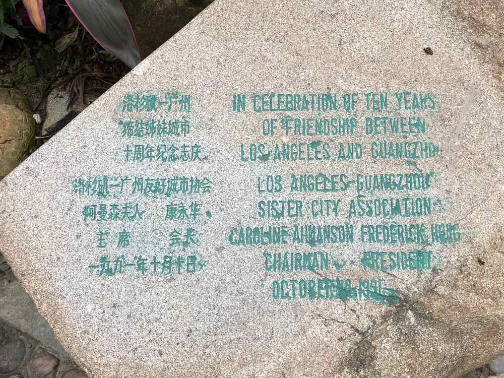 这座花园里有一块纪念石,上边写着“洛杉矶-广州缔结姊妹城市十周年纪念志庆”,落款是1991年。洛杉矶-广州友好城市协会联席会长康永华当年就在现场,纪念石上有他的名字。34年后再来到这座公园,他说,这里的树更茂盛了。