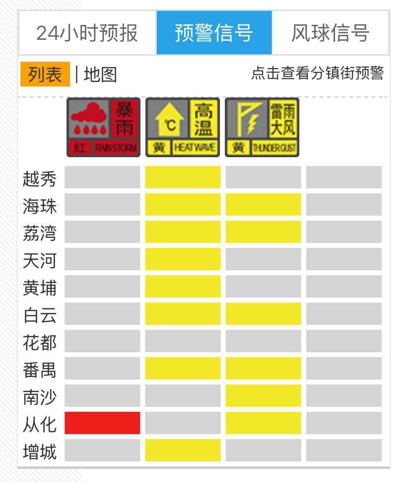 截至7月31日22时30分,广州部分地方已因夜间持续降水而发布暴雨或雷雨大风预警信号。在从化,吕田地区因多个站点雨量接近90毫米,已在21时20分起发布暴雨红色预警信号。海珠、荔湾、白云、番禺、南沙、从化等区,发布雷雨大风黄色预警信号。除花都、南沙、从化外,广州其余各区维持发布高温黄色预警信号。