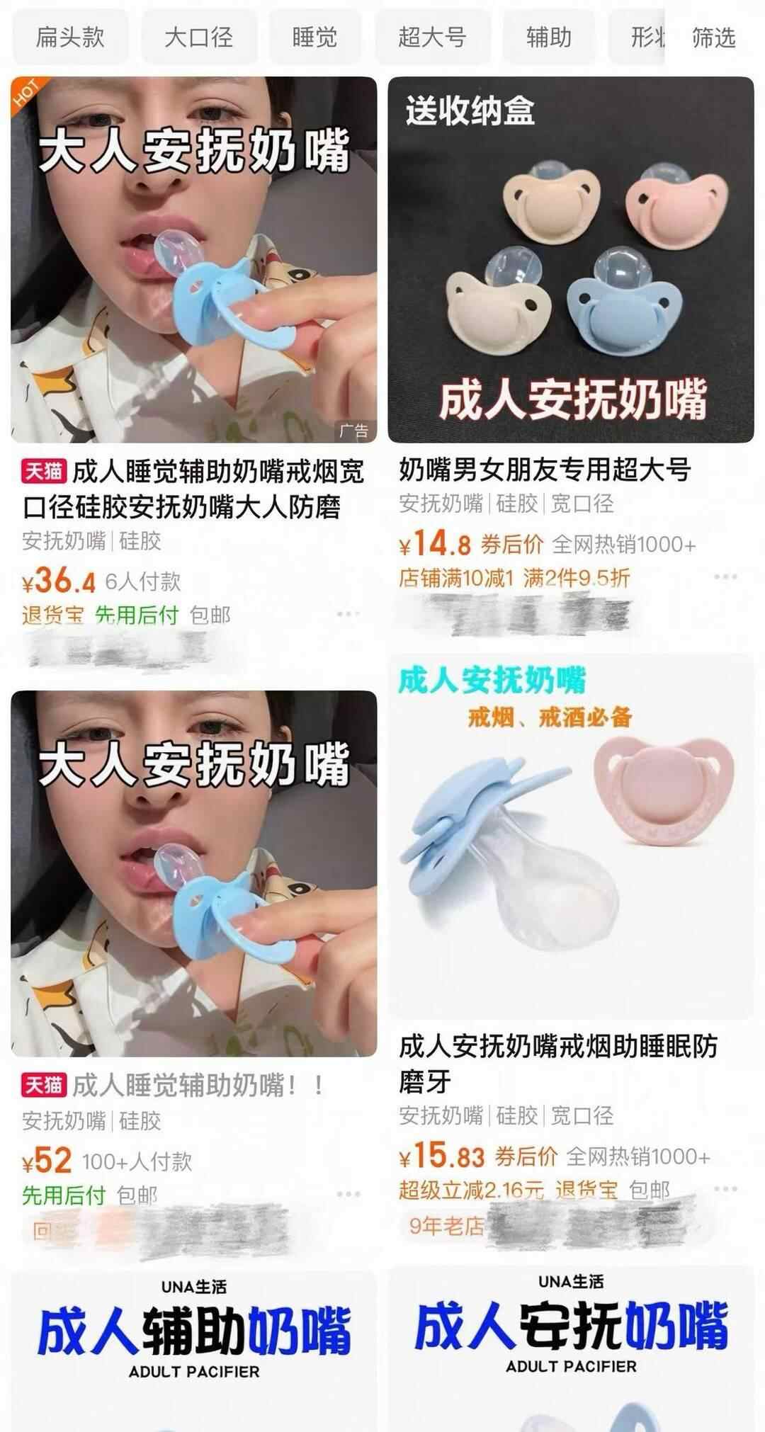 硅胶奶嘴不再只是婴儿专属,电商平台上标榜“解压助眠”的成人安抚奶嘴正在成为新消费潮流,月销量破千的单品比比皆是。