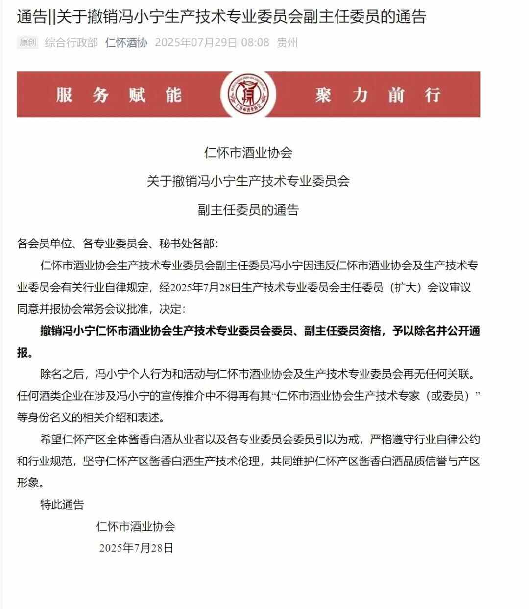 7月28日,贵州省仁怀市酒业协会公开通报称,仁怀市酒业协会生产技术专业委员会副主任委员冯小宁因违反仁怀市酒业协会及生产技术专业委员会有关行业自律规定,经2025年7月28日生产技术专业委员会主任委员(扩大)会议审议同意并报协会常务会议批准,决定:撤销冯小宁仁怀市酒业协会生产技术专业委员会委员、副主任委员资格,予以除名并公开通报。