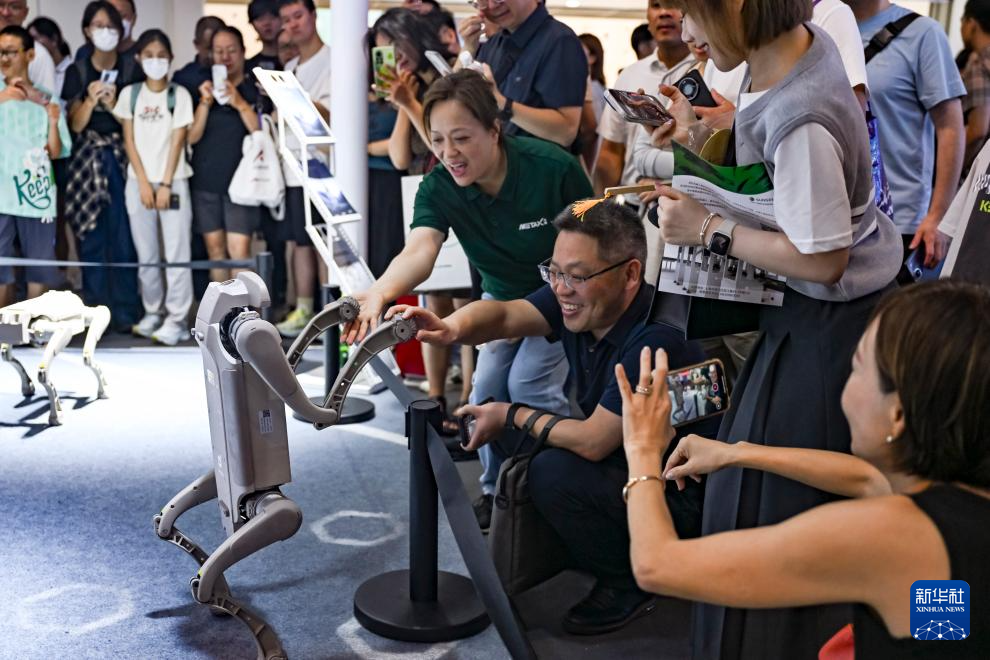 7月29日,参观者和一款机器狗互动。