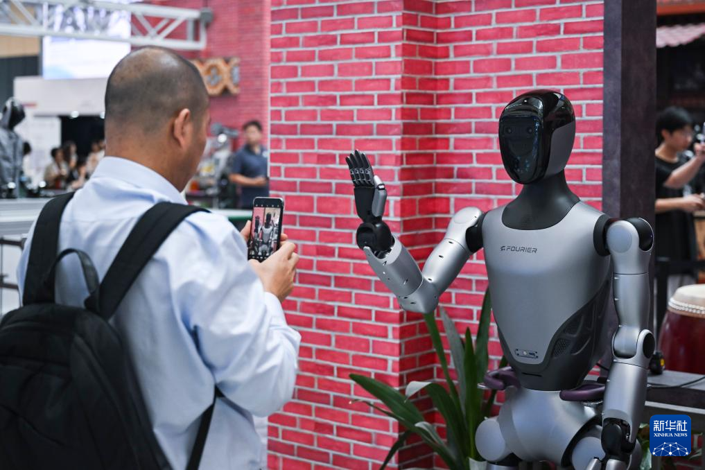 7月29日,参观者和一款人形机器人互动。