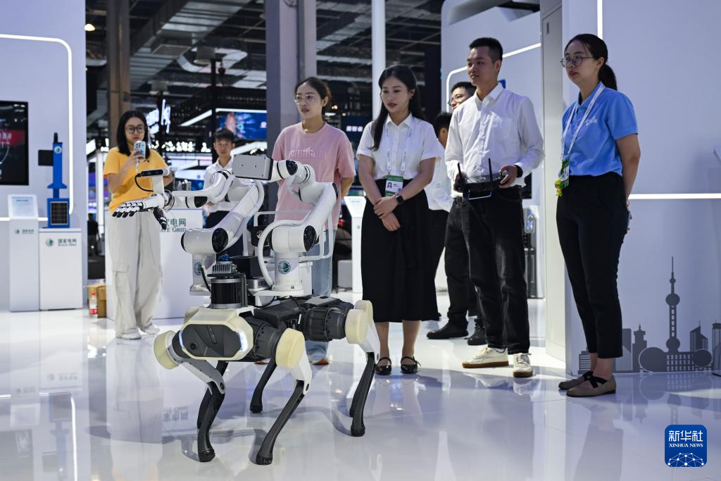 7月29日,参观者在国家电网展区观赏一款用于巡检工作的机器狗。